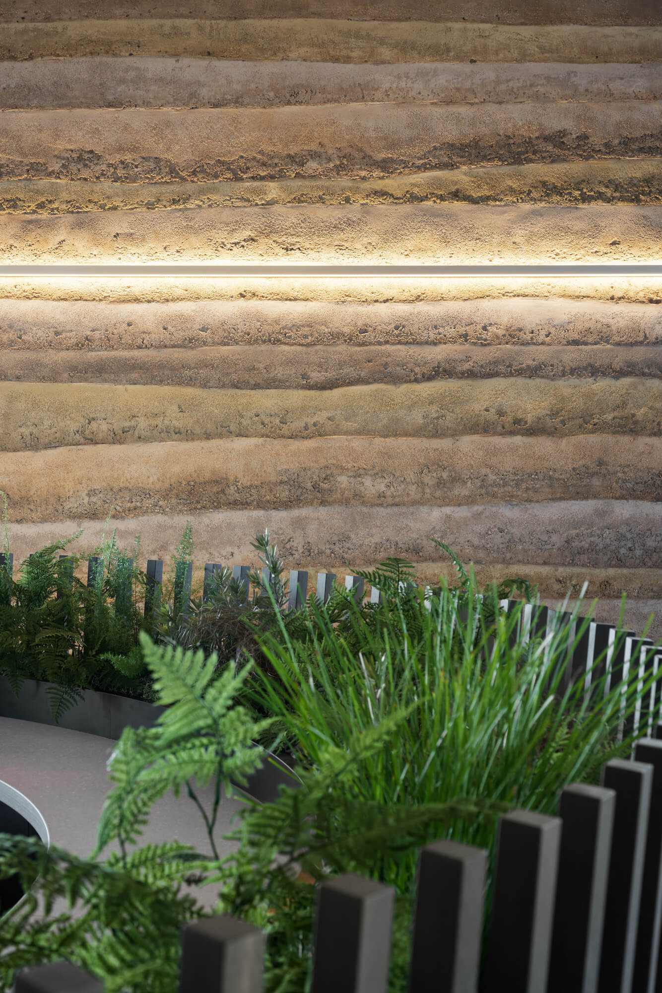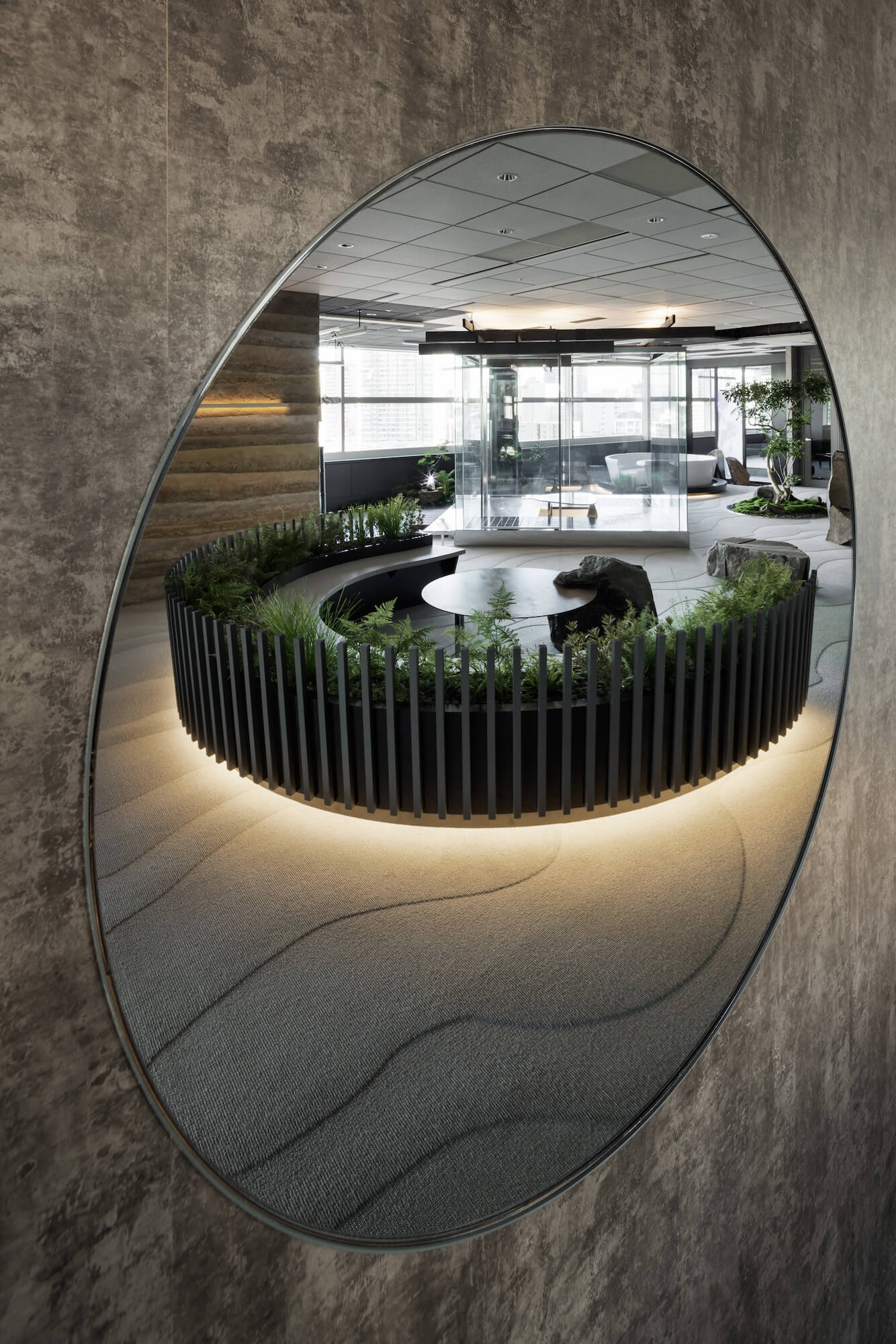 「才華」という美しい日本語を社名の由来とするところから、全体を日本庭園に擬えインテリアグリーンや自然石を用いて表現。