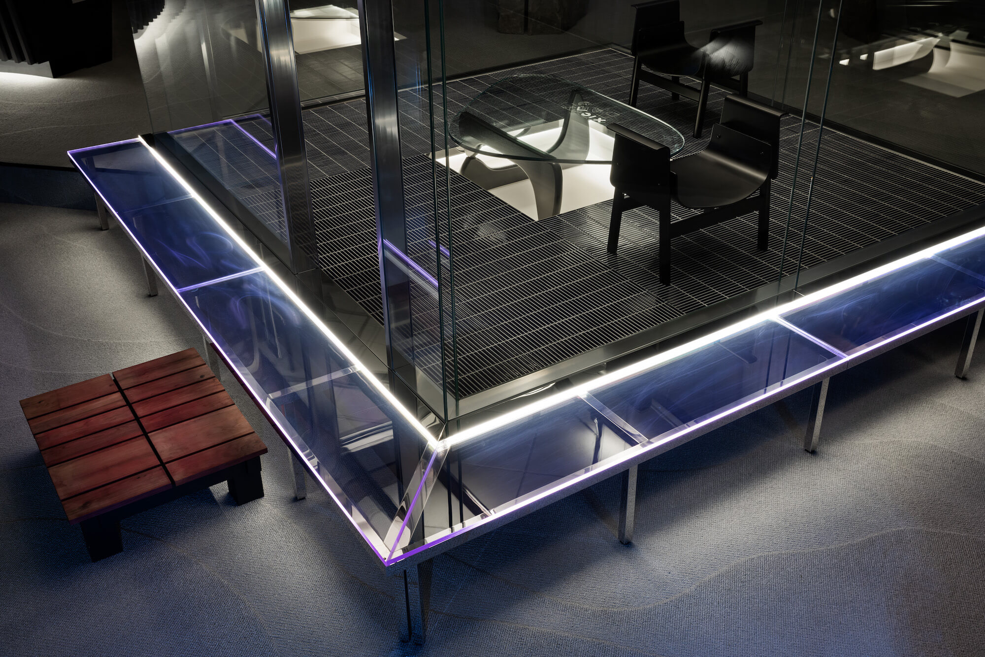 石庭や竹林、池泉などの要素を各所に設け、光の演出や自然石の造作家具がアクセントとなっている。また、風景の動きとしてプロジェクションマッピングがきっかけになる点も空間デザインのポイントである。こういった日本の美しい風景を凝縮して、バーカウンターに内蔵したパルダリウムが全体をまとめる役割を担う。