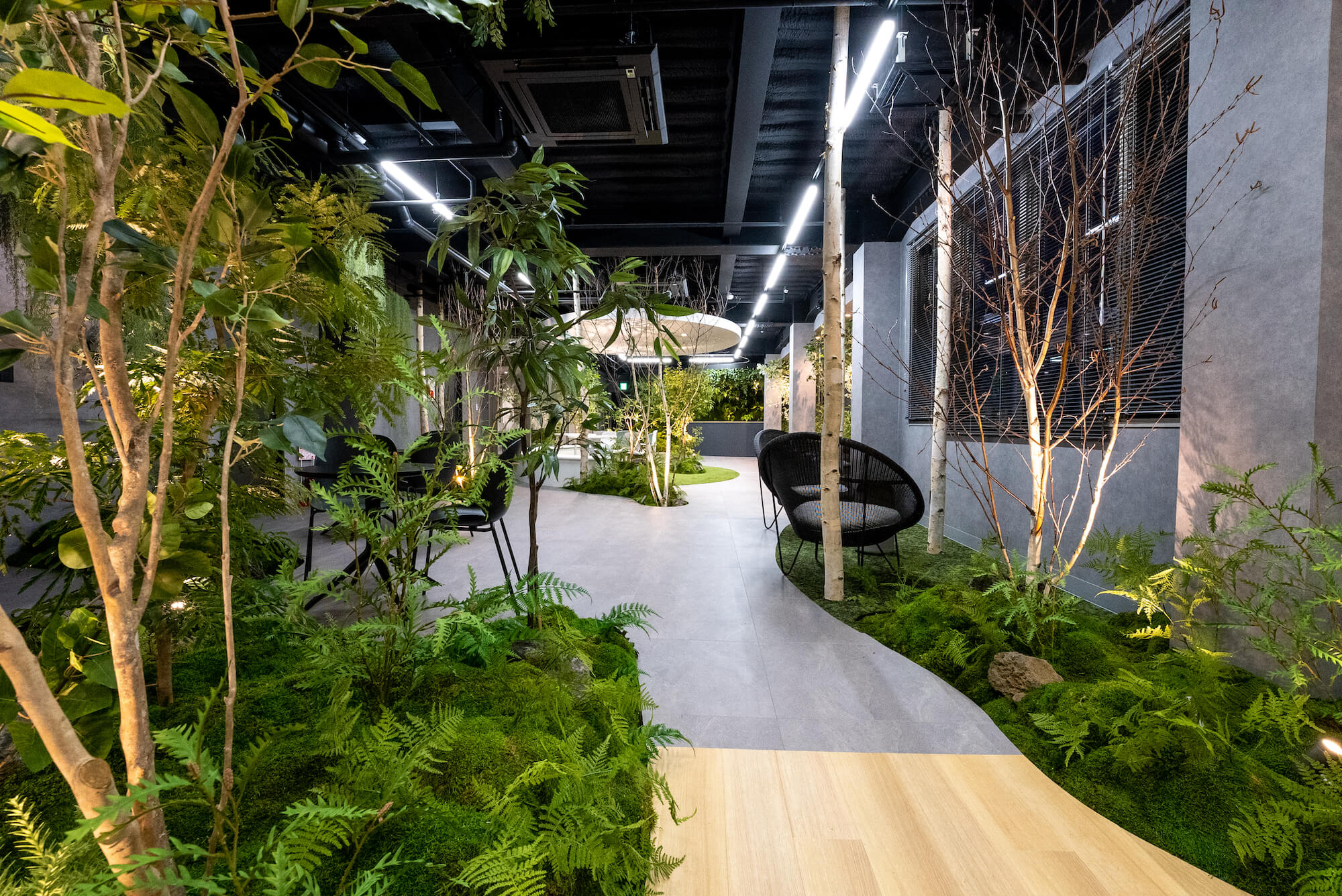 新築ビルの外構植栽プランから室内3フロアの緑化デザイン施工に加え、内装や外観にかけてのトータルプロデュースを行なった本社移転プロジェクトである。